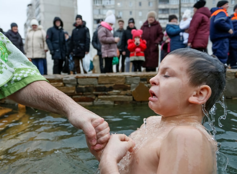 在反政府軍把持的盧甘斯克(Luhansk),一名男孩泡入冷水中淨身,藉此慶祝主顯節的到來。