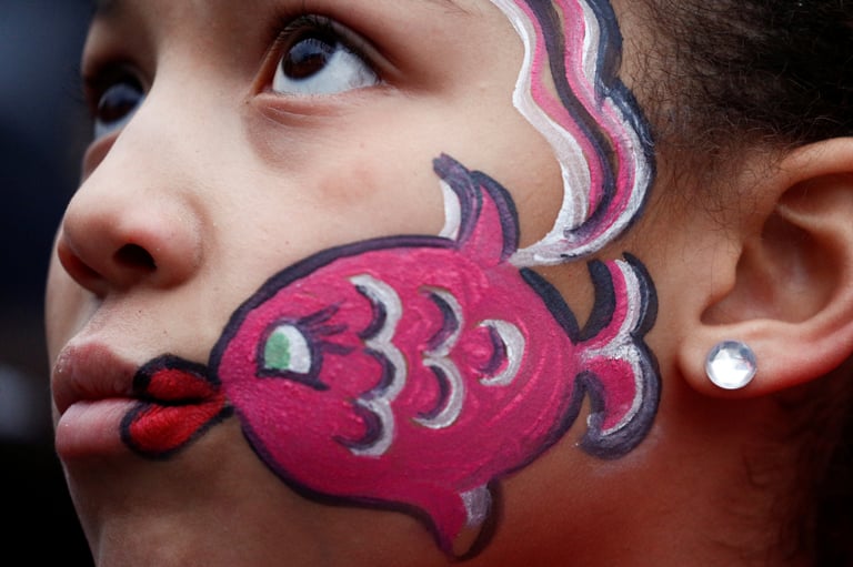 在北部城市波隆那(Bologna),一名小女孩臉上頂著金魚彩繪,和大批手拿沙丁魚圖案海報的民眾上街抗議,一塊反對義大利右翼政黨「北方聯盟」的領導人薩爾維尼(Matteo Salvini),薩爾維尼強勢的反移民立場是讓他們走上街頭的理由。