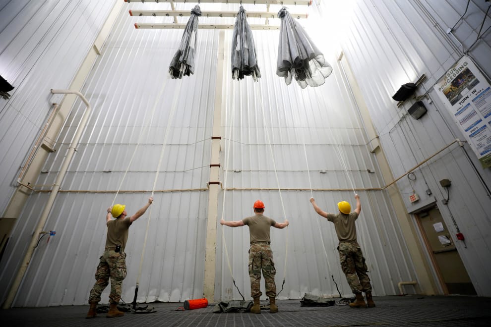 在北卡羅萊納州(North Carolina)的布雷格堡(Fort Bragg),美國陸軍第 82空降師傘兵正在檢查使用過的降落傘。