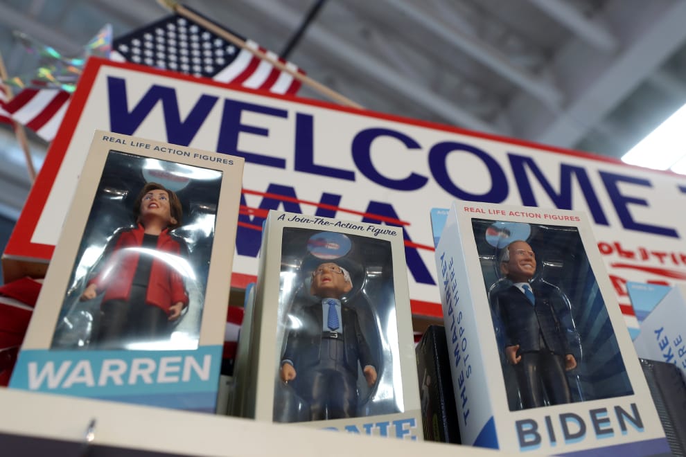 在愛荷華州首府德梅因市(Des Moines),商店內擺出了想要角逐 2020民主黨總統候選人的麻州參議員華倫(Elizabeth Warren,左)、佛蒙特州參議員桑德斯(Bernie Sanders,中)和美國前副總統拜登(Joe Biden,右)的公仔。