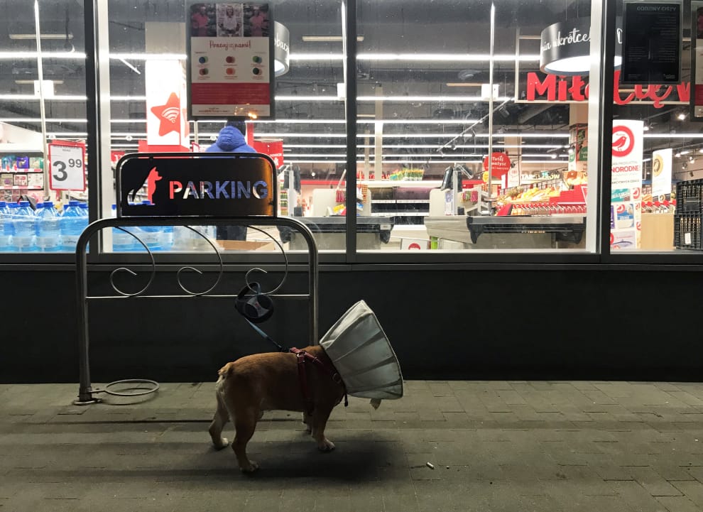 在波蘭港口城市格地尼亞(Gdynia),一隻狗狗被「停」在超市外,等待主人的回來。