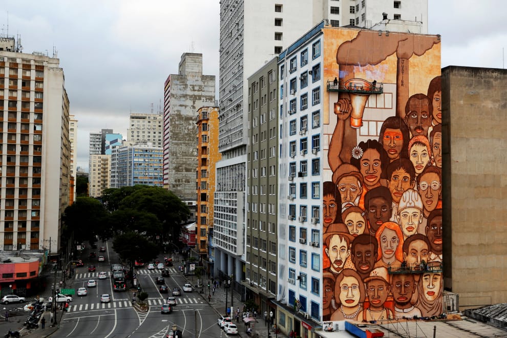 在聖保羅,巴西藝術家利用來自潰堤水壩收集到的泥土,畫成了一幅壁畫悼念在去年水壩潰堤事件中喪命的罹難者。