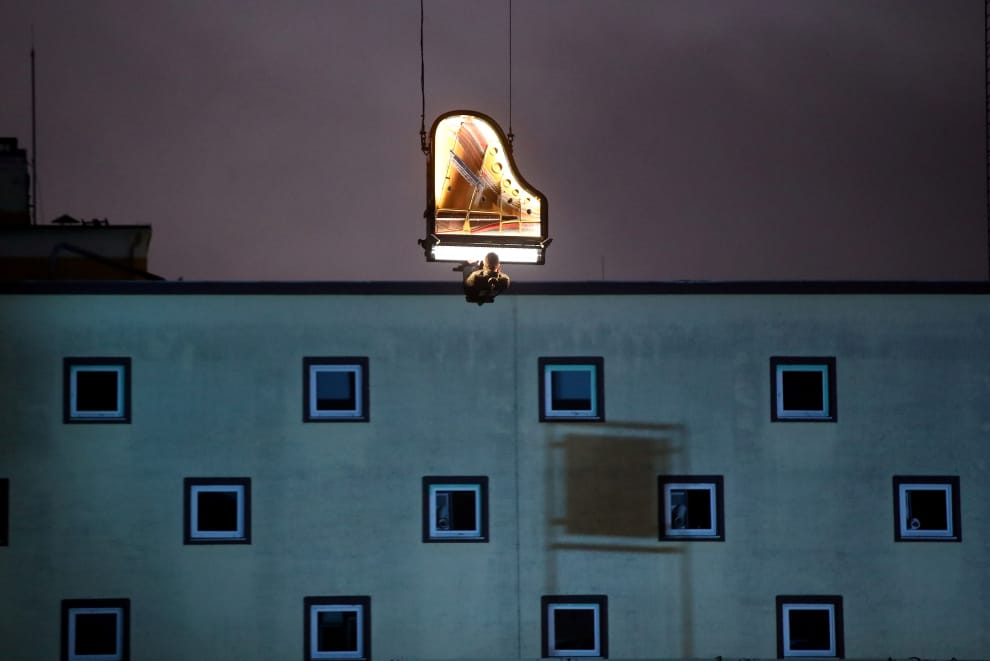 在慕尼黑的一處工地,瑞士鋼琴家羅奇(Alain Roche)吊在半空中彈鋼琴。