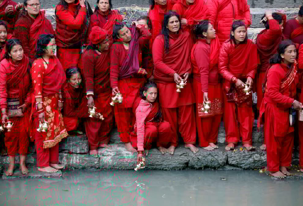 在帕斯帕提納寺(Pashupatinath)前方,信徒們手拿容器等著裝來自巴格馬堤河(Bagmati River)的聖水回家。