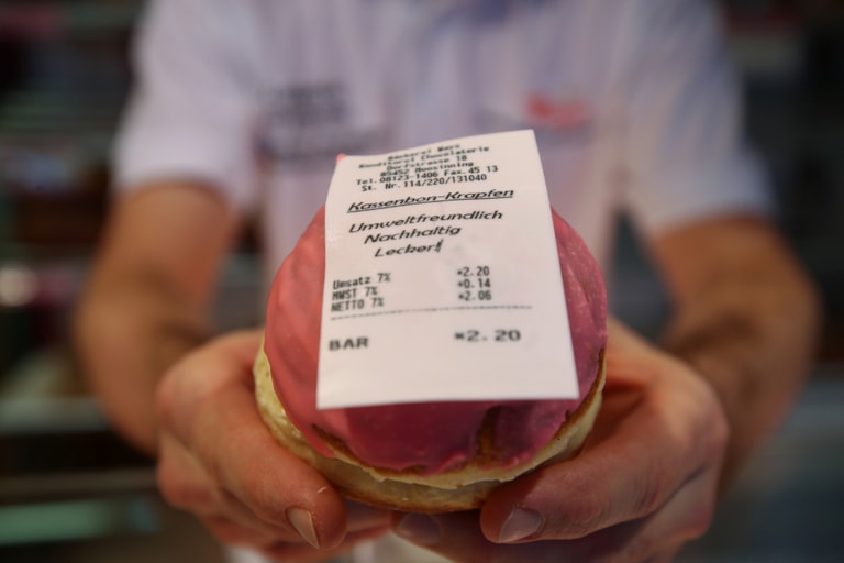 在靠近慕尼黑的莫西寧格鎮(Moosinning),麵包師傅格柏因(Ludovic Gerboin)捧著加上一張糖霜收據的甜甜圈,抗議德國新法要求所有零售商都要開收據給顧客。