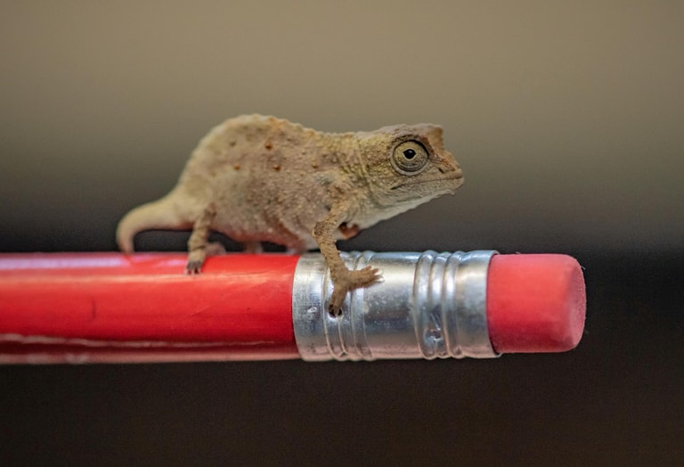 在英國西北部的切斯特動物園(Chester Zoo),可以看到一隻侏儒變色龍(Rhampholeon)站在鉛筆上。