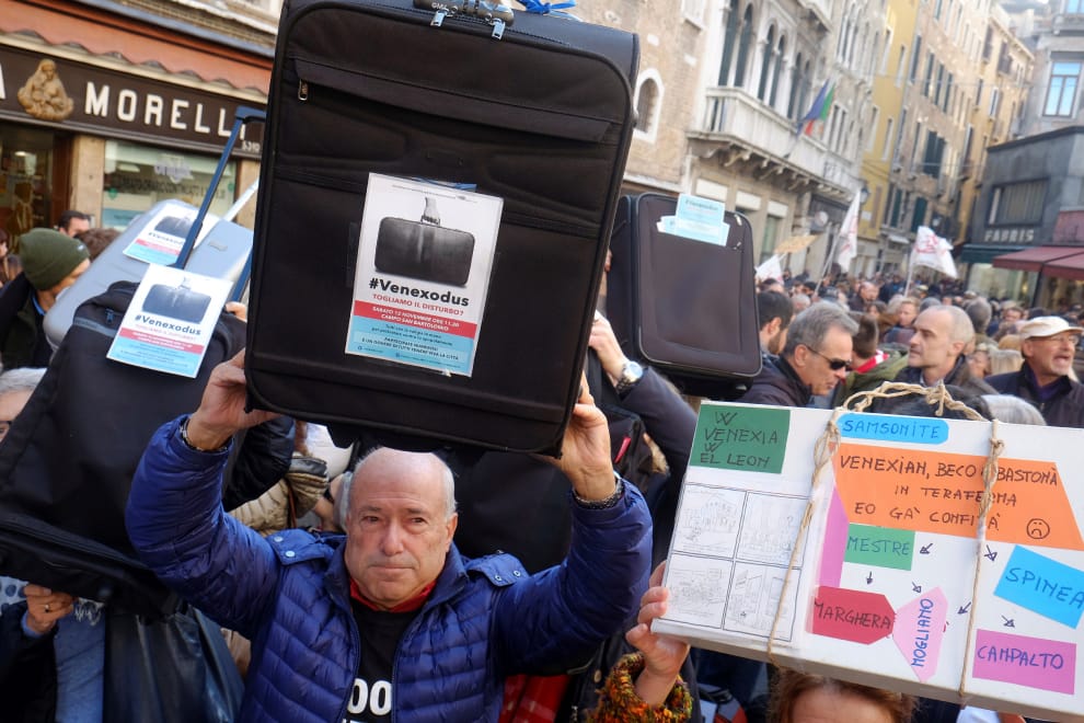 2016年11月,威尼斯居民高舉著行李箱走上街頭,呼籲當局不要只重觀光、漠視居民需求。