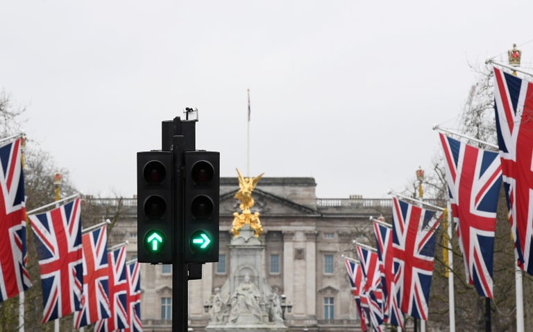 在倫敦從白金漢宮延伸而出的林蔭路(The Mall),可以看到一面面英國國旗。
