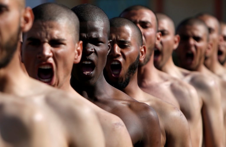 在位於加薩市的警察學院,正在接受訓練的學員們精神抖擻地喊口號。