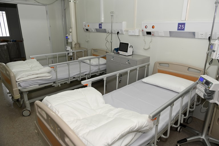 快速、低成本興建而成的火神山醫院病房比外界想像的還要樸素。裡頭只有 2張病床、必要的醫療設備、衛浴,除此之外沒有多餘的裝飾擺設。