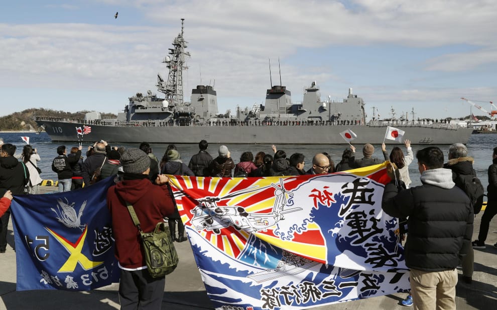 在位於東京灣入口的橫須賀市海軍基地,人們揮舞著旗幟替日本海上自衛隊的驅逐艦高波號(Takanami)送行,它即將航向中東的阿曼灣協助保護來往的商船和油輪。