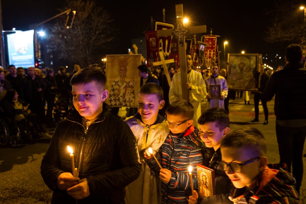 在首都波德戈里察(Podgorica),隸屬東正教會的塞爾維亞正教會(Serbian Orthodox Church)信徒拿著十字架和蠟燭上街抗議國會新通過的宗教法。