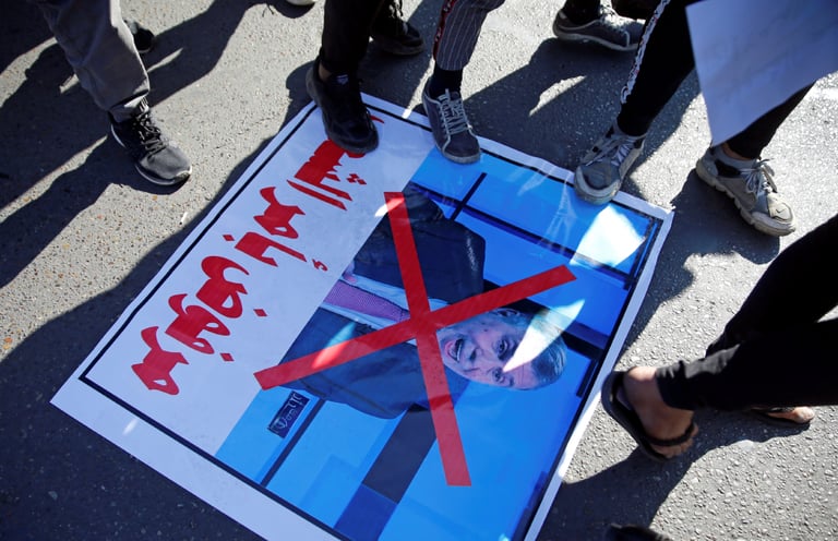 在首都巴格達,憤怒的抗議民眾腳踩印有伊拉克新總理阿拉維(Mohammed Tawfiq Allawi)照片的海報,反對總統指派他擔任總理。目前,大批民眾仍在巴格達和數大城市示威抗議,要求當局全面改革伊拉克的政治體制。