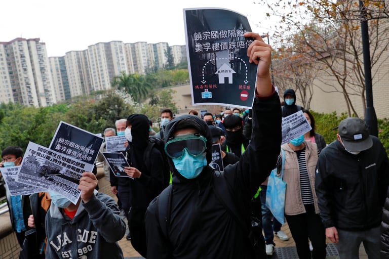在美孚新村,當地居民上街抗議當局準備把饒宗頤文化館旅館當作隔離武漢肺炎接觸者之用,他們擔心這麼做可能會造成當地房價下跌。
