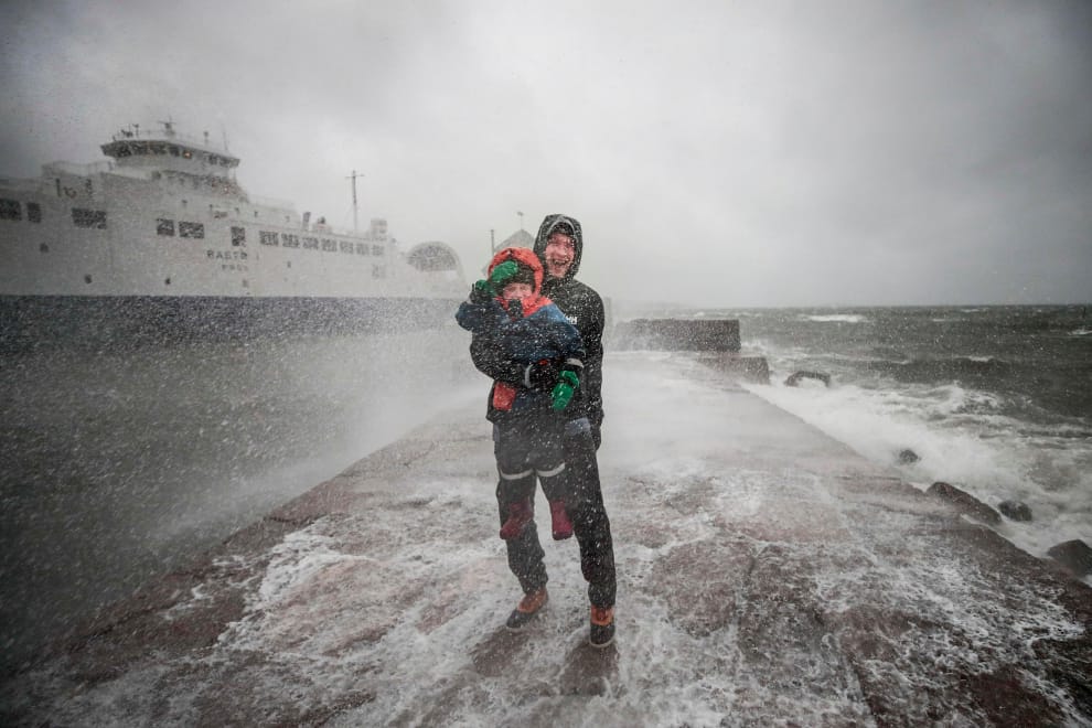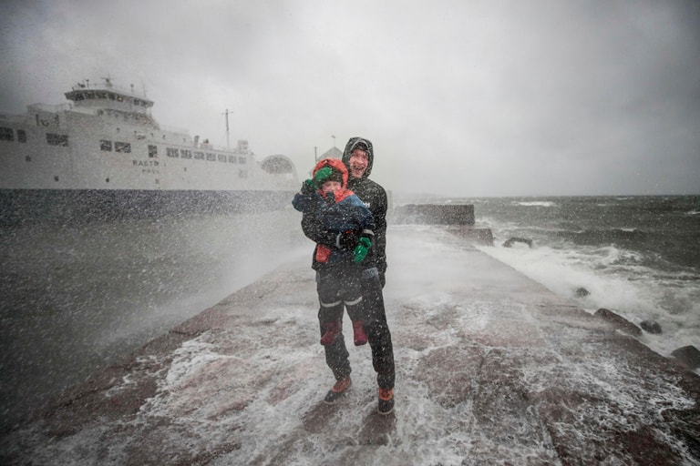 在挪威南部沿海城市莫斯(Moss),戈爾捷耶夫(Dmitrij Gordejev)抱著他今年 5歲的兒子丹尼爾(Daniel)站在海港旁,體會白浪滔滔的威力。