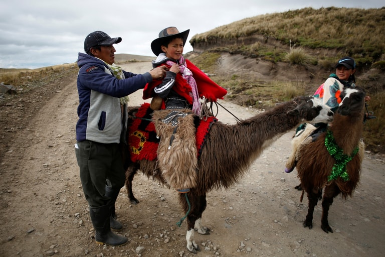 在良加納特斯國家公園(National Park of Llanganates)附近,孩子們紛紛坐上羊駝,準備參加羊駝賽跑(Llamingada)活動。