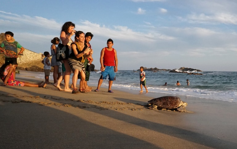 在太平洋沿岸的馬尊特(Mazunte)小鎮,人們開心目送一隻海龜緩緩返回大海。這隻海龜先前被人從赤潮中救出,隨後送往墨西哥海龜中心療傷,最近終於可以回到大海。
