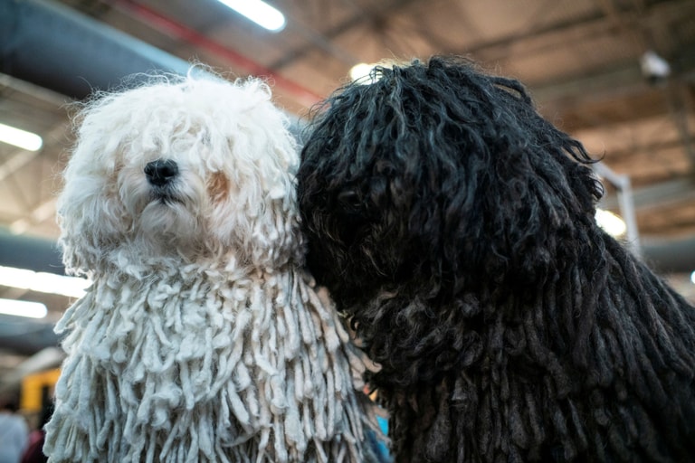 在紐約舉辦的威斯敏斯特犬舍俱樂部狗展(Westminster Kennel Club dog show)上,一黑一白兩隻波利犬(Puli dogs)正在後臺為表演做準備,牠們宛如粗繩般的毛髮有極佳的防水效果。