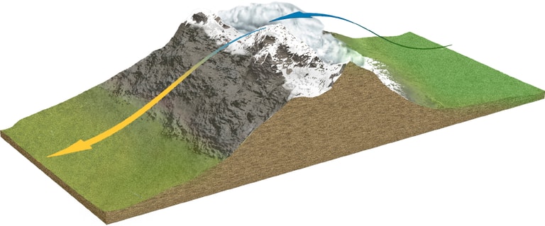 註 1:當風經過山區,在迎風面受地形抬升、溫度降低、水氣凝結形成降雨;翻過山頂後成為乾空氣,沿著背風面山坡向下移動升溫,而形成乾燥、炎熱的焚風。