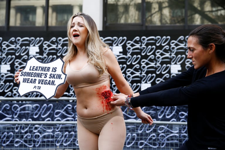 在舉辦倫敦時尚周的地點,「善待動物組織」(PETA)的成員上演了一齣行動劇,呼籲民眾不要使用皮革製品,因為皮革就是動物的皮,在剝皮的過程中動物會受到極度痛苦後死亡。
