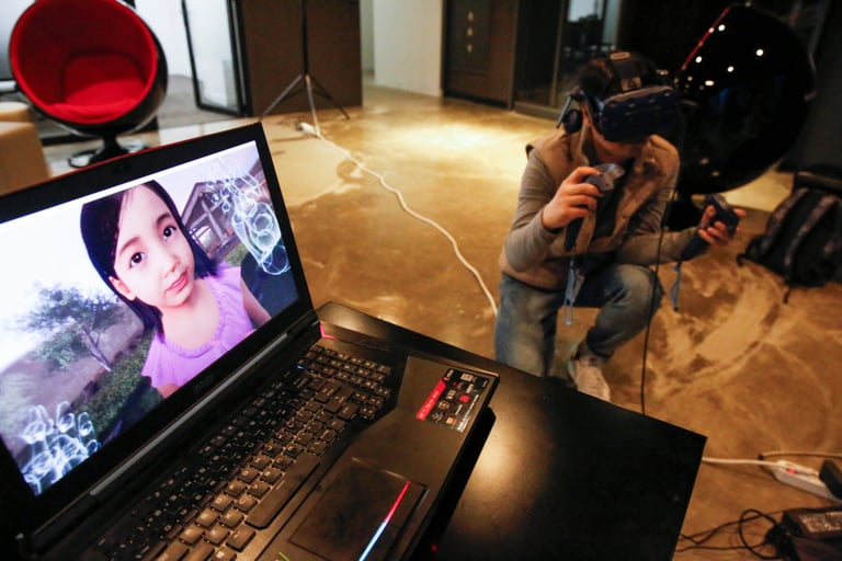 在首爾的一間公司內,VIVE Studios的導演李賢碩(Lee Hyun-suk,音譯)正在試驗VR模擬器,一旁的電腦螢幕上出現了「娜妍」的模樣。