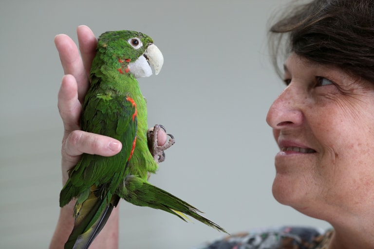 在聖保羅州的巴雷圖斯鎮(Barretos),獸醫潘納莉(Maria Angela Panelli)正在檢視她幫鸚鵡裝的人造樹脂鳥嘴。