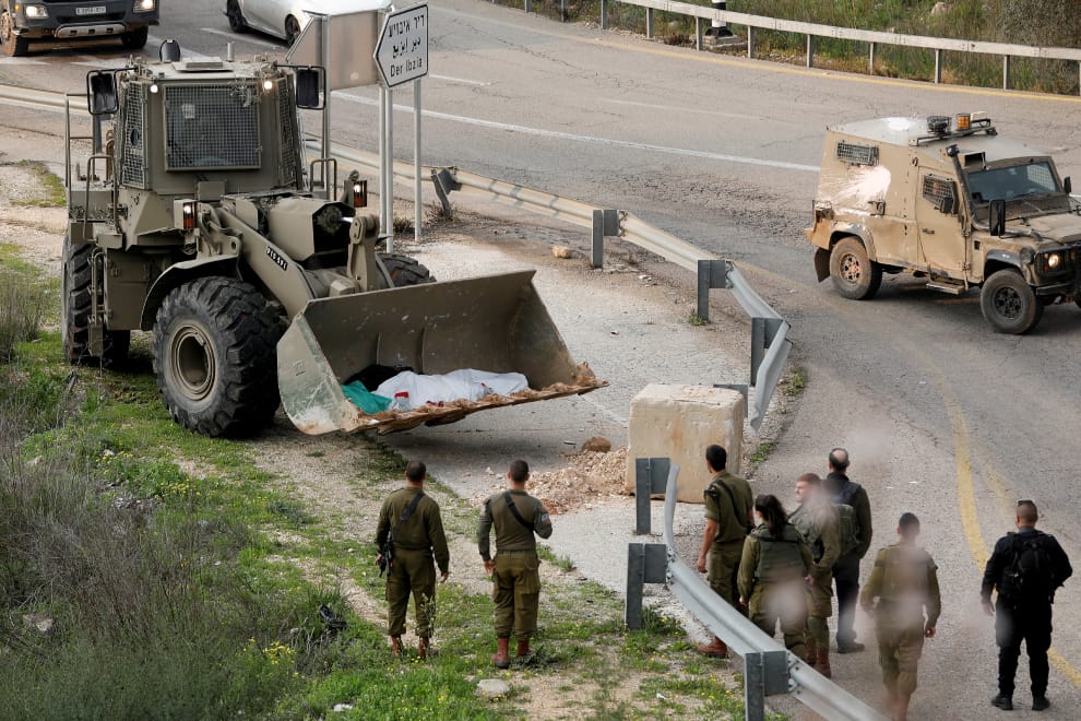 在以色列佔領的約旦河西岸,一具遺體被以色列軍車給載走,這裡剛剛發生了以巴衝突,導致民眾死傷。