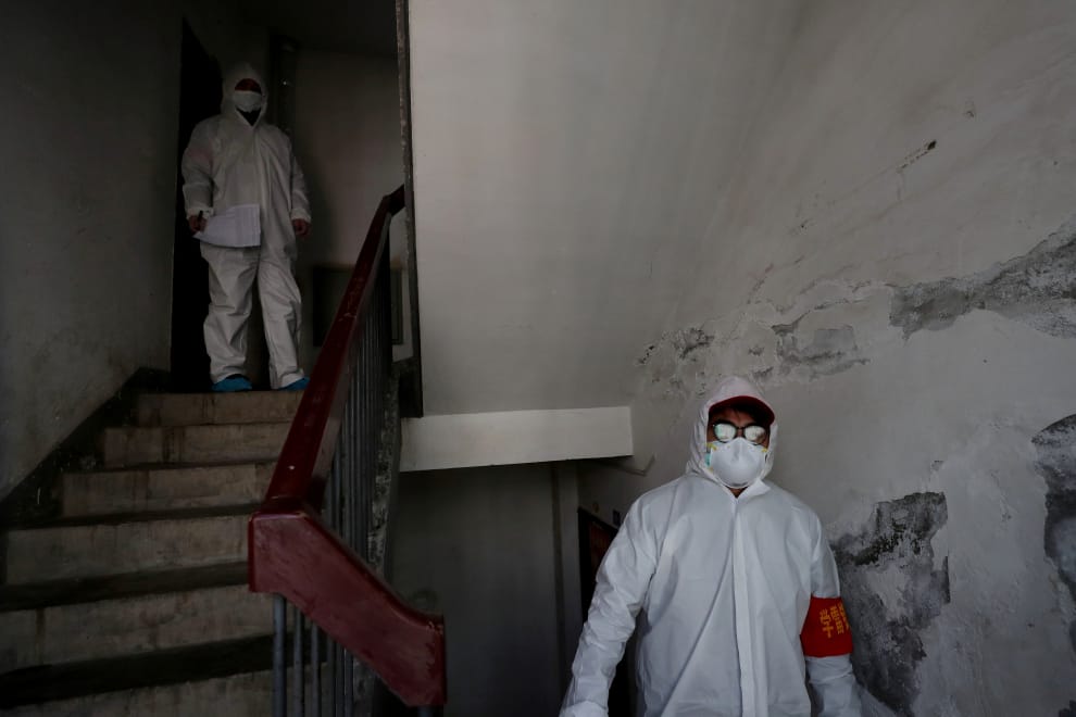 在COVID-19(武漢肺炎)疫情最嚴重的湖北省武漢市,防疫人員身穿隔離衣、挨家挨戶地檢查民眾是否遵照指示在家自主隔離。