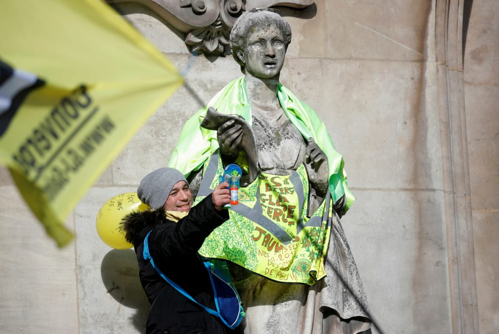 在巴黎加尼葉歌劇院(Opera Garnier)外頭,示威民眾替雕像套上了黃背心,一起抗議法國總統馬克宏(Emmanuel Macron)的退休金改革計畫,該計畫即將在國民議會展開辯論。