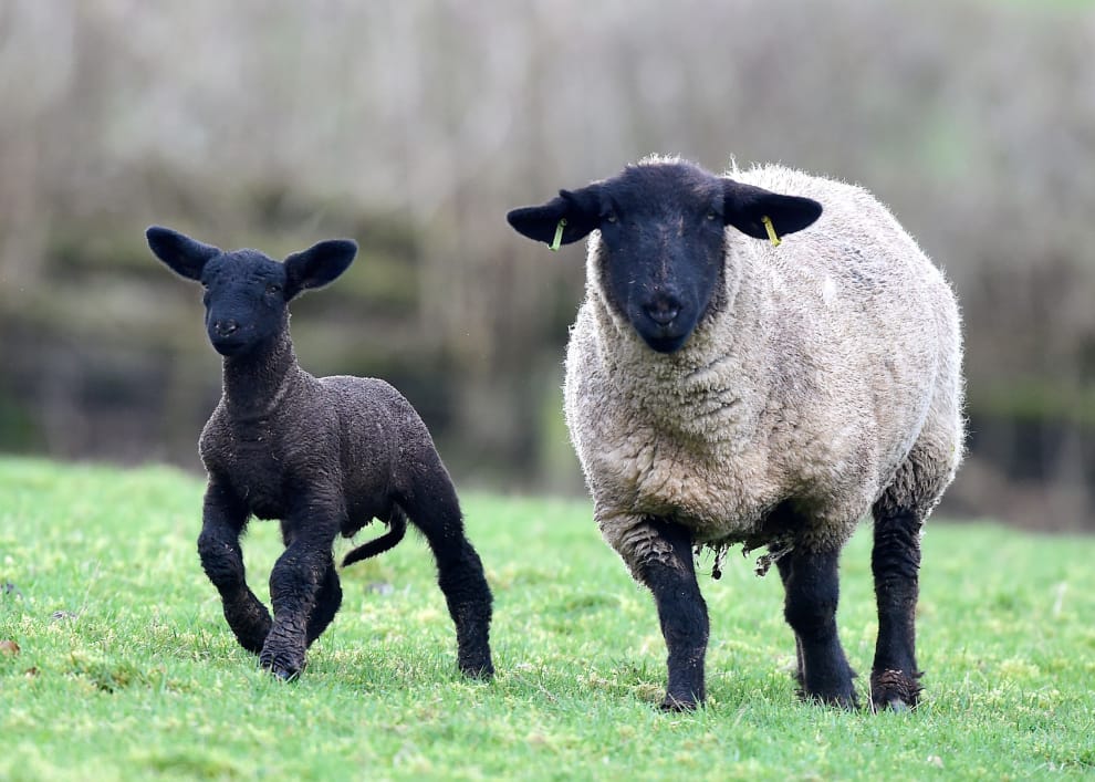 在位於威爾斯中部的布雷肯市(Brecon),一隻薩福克綿羊(Suffolk sheep)和牠三周大的孩子在農場上奔跑,牠們不久前才從遭丹尼斯風暴(Storm Dennis)重創的災區被救出。