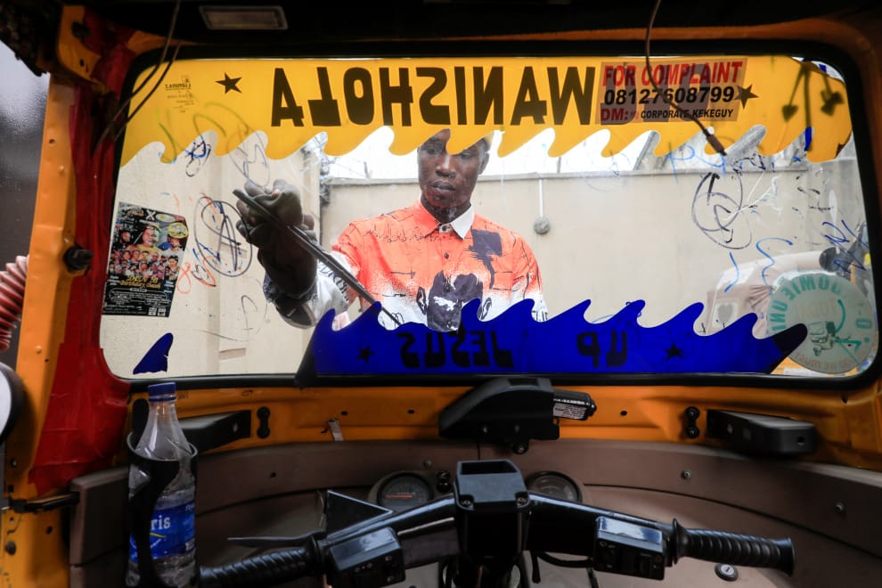 在非洲第一大城拉哥斯(Lagos),一名三輪車司機正在洗車。