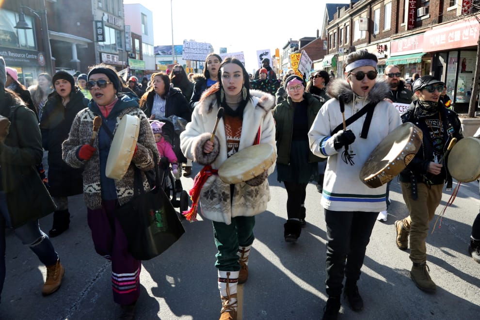 在安大略省首府多倫多,支持原民社群Wet'suwet'en Nation的民眾上街示威,抗議英屬哥倫比亞省的石油天然氣公司Coastal Gaslink Pipeline在興建天然氣管線時破壞了原民保留地。