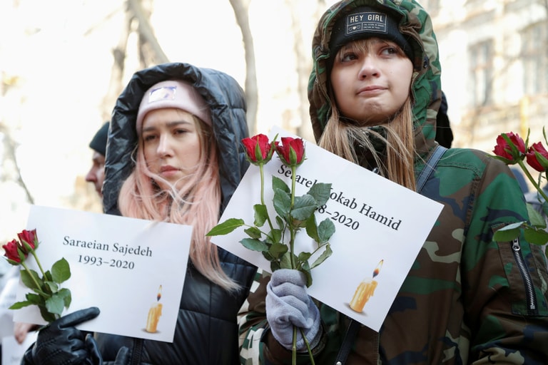 在基輔的伊朗大使館前,人們手拿玫瑰和印有罹難者姓名的海報,悼念他們在今年一月的烏克蘭班機遭誤擊事故中身亡。
