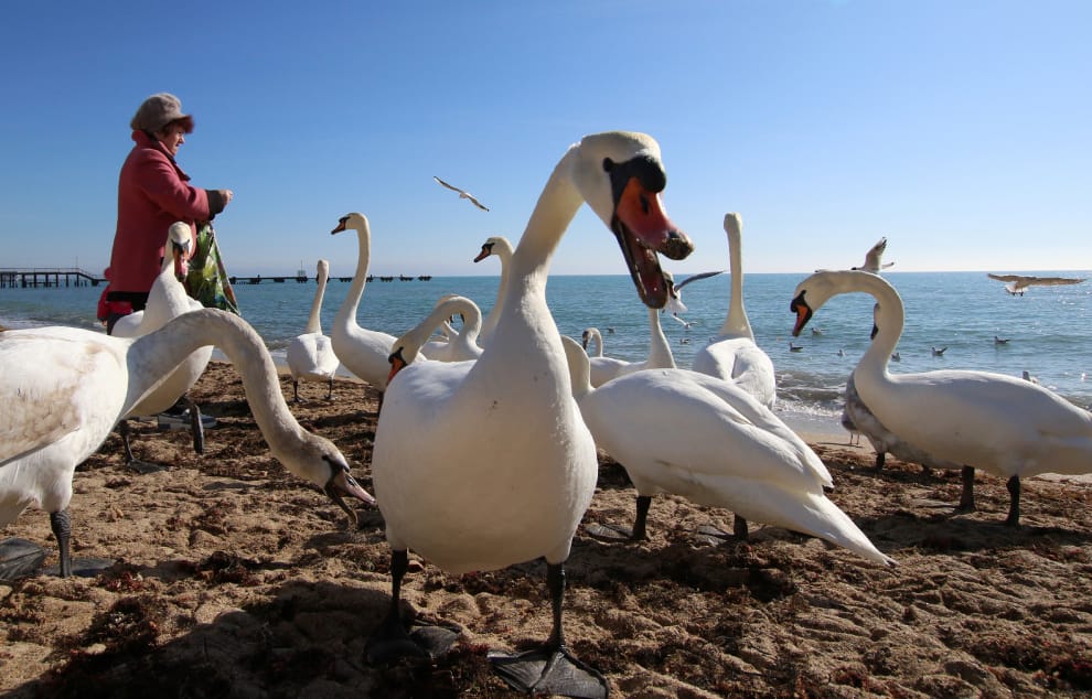 在克里米亞半島的黑海港口城市葉夫帕托里亞(Yevpatoriya),一名女子正在餵盤據在海灘上的天鵝。
