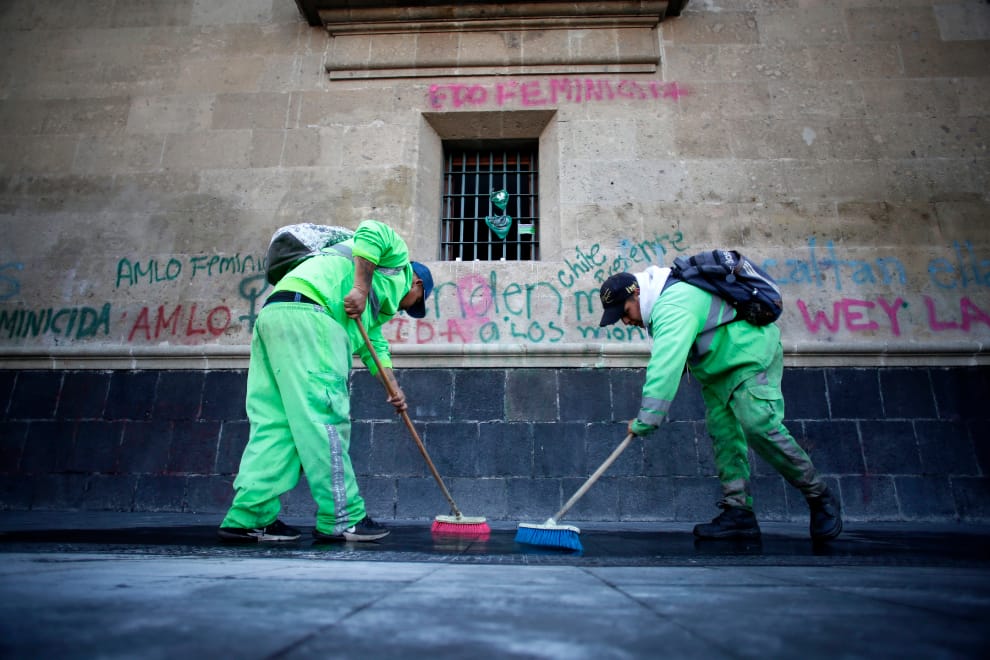 在墨西哥市,清潔工人忙著清理墨西哥國家宮(National Palace)外頭的塗鴉,這裡在上周發生一場人數眾多的示威活動,民眾齊聲抗議政府沒有積極保護女性的人身安全,讓 7歲小女孩阿爾德里蓋特(Fatima Cecilia Aldrighett)和 25歲的愛絲卡米拉(Ingrid Escamilla)死於非命。