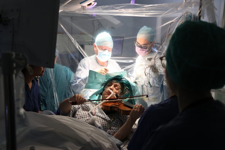 術後,阿席坎醫生說:「我們一年平均動 400台手術,通常只做簡單的語言測試。這是我第一次在手術過程中,讓患者演奏樂器。」