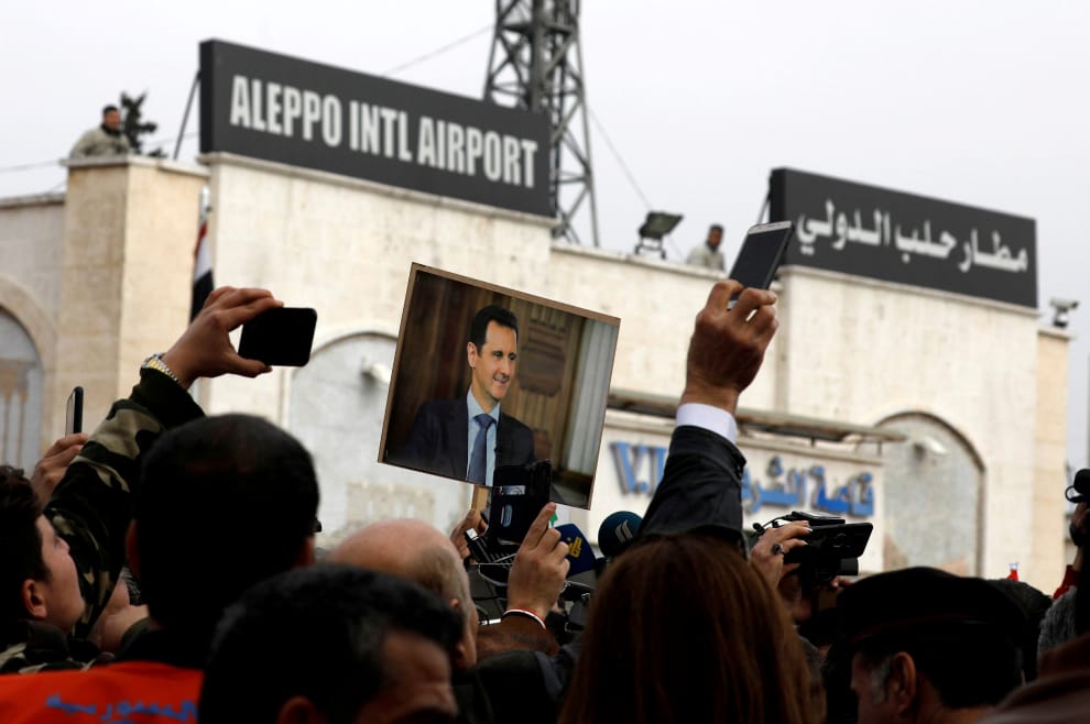 在重新開張的阿勒坡國際機場前,興奮的民眾高舉敘利亞總統阿薩德(Bashar al-Assad)的照片慶祝。當地受敘利亞內戰所苦,國際機場已經關閉了好幾年,這次終於重新運作,開始接待來來往往的航班和旅客。