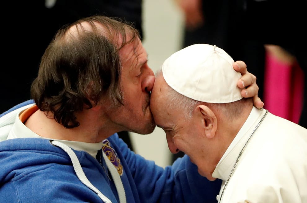 在梵蒂岡舉辦的每周彌撒上,一名男子正在親吻羅馬天主教宗方濟各(Pope Francis)的額頭。