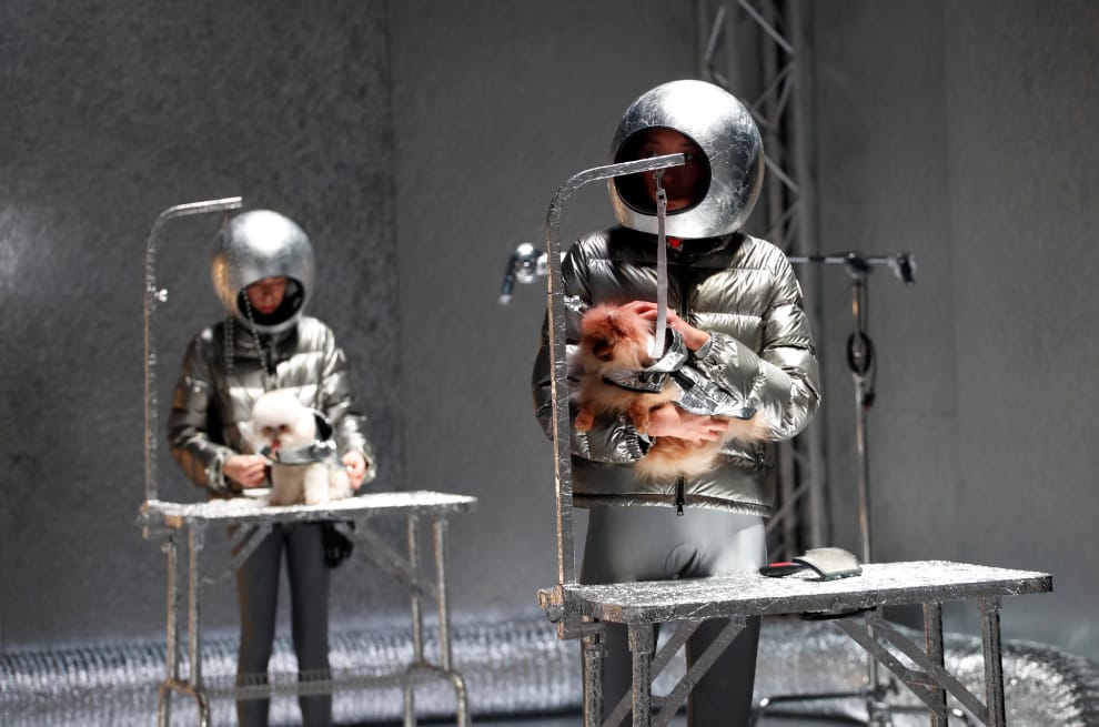 在米蘭時裝周上,模特兒們穿上以羽絨衣和運動服飾著名的法國品牌Moncler,與小狗們一起呈現設計師的 2020秋冬創意。