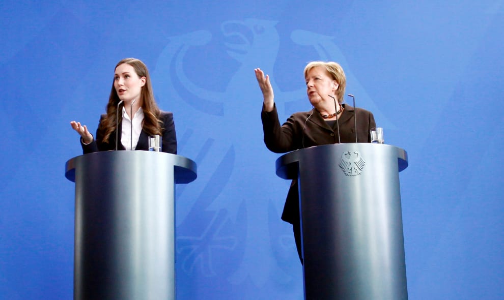在柏林召開的德國和芬蘭記者會上,可以看到全世界最年輕在職總理──芬蘭總理馬林(Sanna Marin,左)和德國總理梅克爾( Angela Merkel,右)。