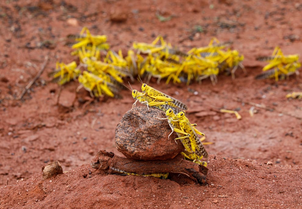 在受到蝗災攻擊的東部省(Eastern Province),可以看到一對對的蝗蟲正在交配。