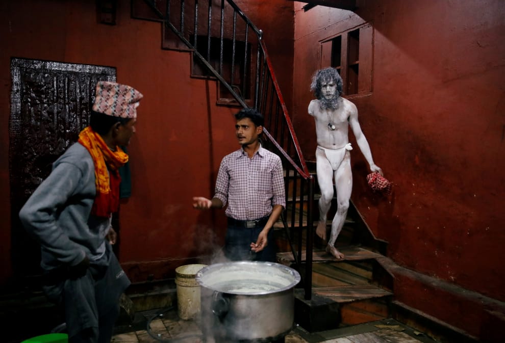 在位於加德滿都的印度教神廟帕舒帕蒂納特廟(Pashupatinath Temple),一名全身塗滿灰的苦行僧走進修道院中,當地準備開始迎接濕婆節的到來。