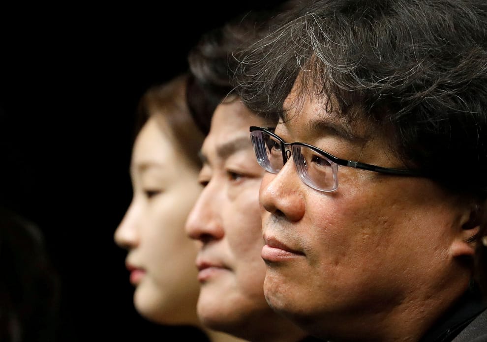 在首爾舉辦的記者會上,以電影《寄生上流》一片拿下美國奧斯卡金像獎四項大獎的導演奉俊昊(右)和演員宋康昊(中)、朴素淡(左)正在受訪。
