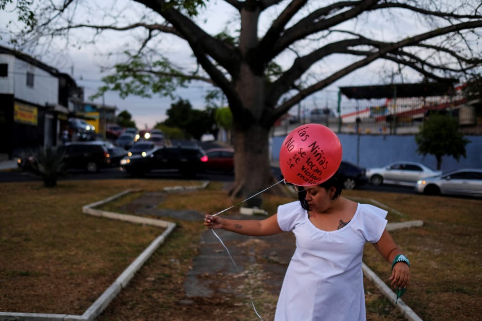 在首都聖薩爾瓦多,一名身穿白色洋裝、手拿紅色氣球的女子正在悼念墨西哥 7歲小女孩阿爾德里蓋特(Fatima Cecilia Aldrighett)。她在 11號時失蹤,結果遺體在周末時被人發現裝在一個塑膠袋中,目前警方正在調查兇嫌的下落。