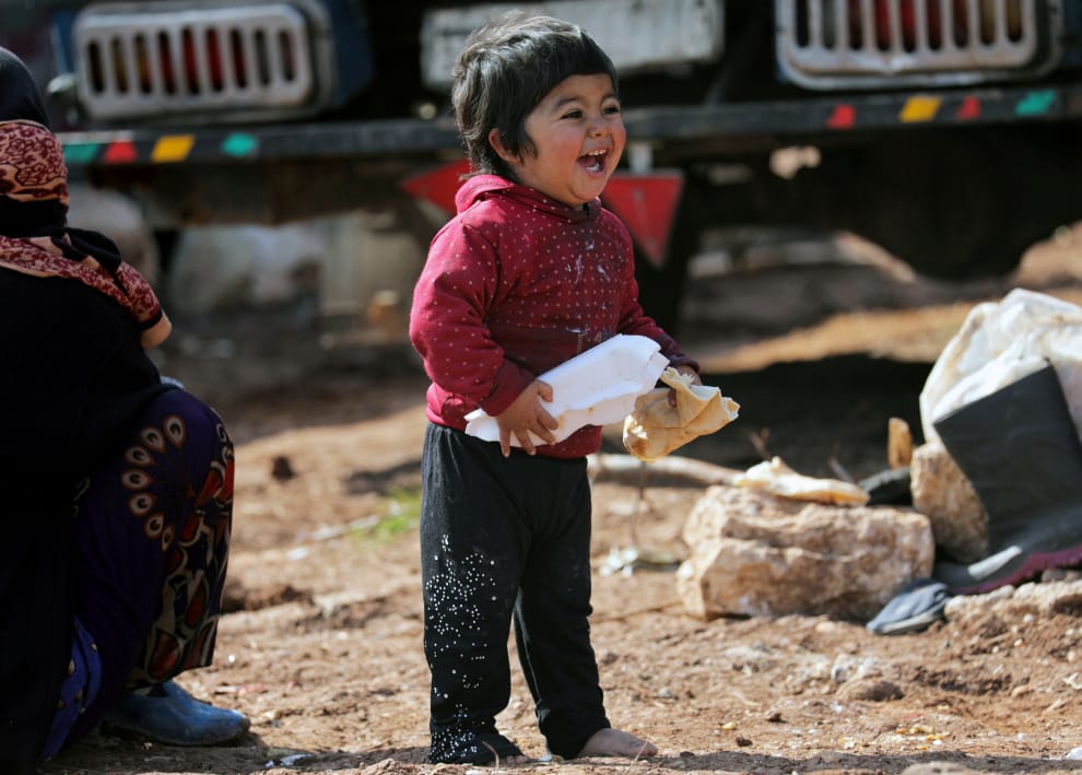 在設立臨時難民營的阿扎茲鎮(Azaz),一名流離失所的小女孩拿到麵包時,開心地對著前方露出笑容。