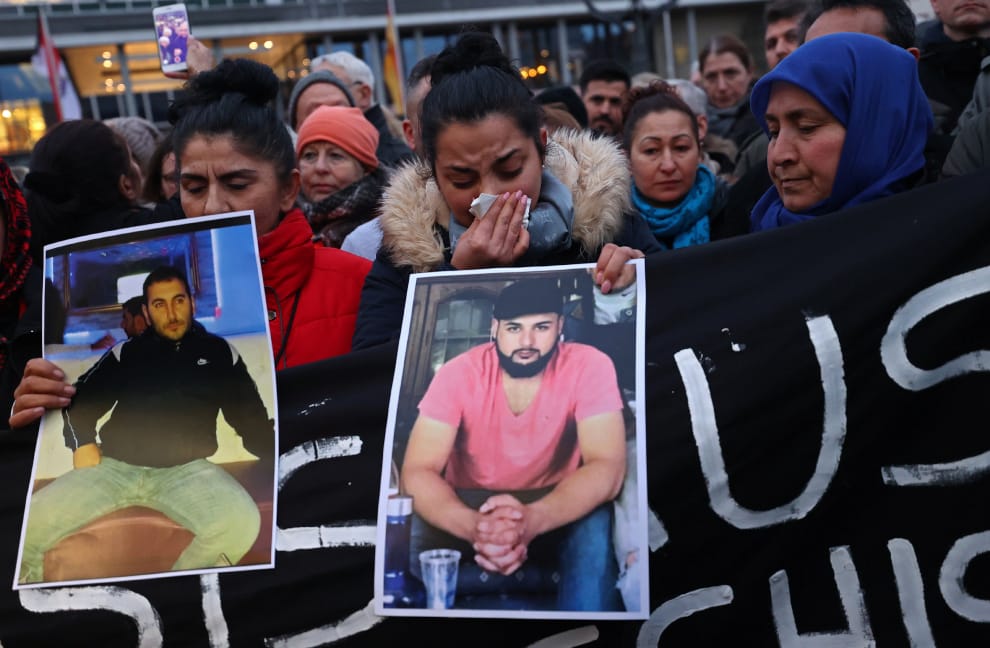 在發生極右派份子持槍掃射水煙館、造成 9人死亡的悲劇後,人們來到位於哈瑙(Hanau)的槍案現場拿著死者照片悼念。