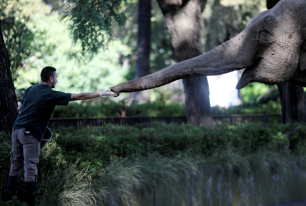 在首都布宜諾斯艾利斯的生態公園,一名獸醫正拿著一顆蘋果要給今年 54歲的亞洲象瑪拉(Mara)吃。