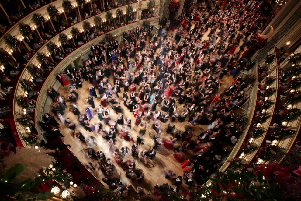在一年一度的維也納歌劇院舞會中,人們穿起禮服在歌劇院中翩翩起舞。