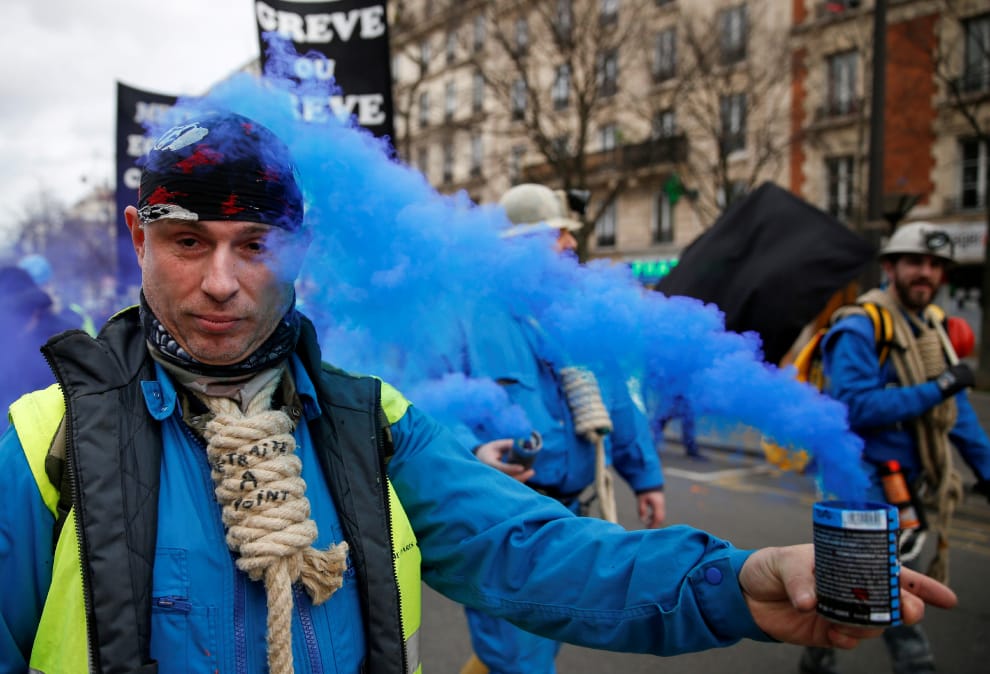 在巴黎街頭,一名身穿黃背心的示威民眾手拿藍煙,和其他民眾一塊抗議法國總統馬克宏(Emmanuel Macron)的退休金改革計畫,該計畫正在國民議會展開辯論。