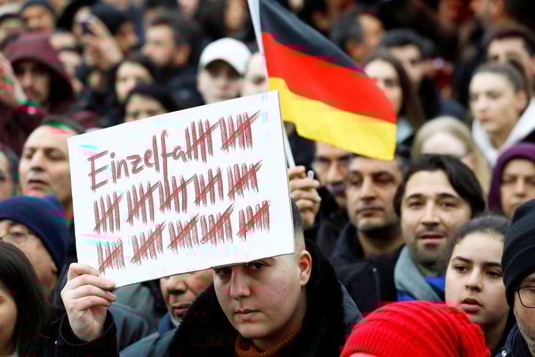 在近日發生極右派恐攻的哈瑙(Hanau),人們上街抗議種族主義和極右派思想。其中,一名男子手舉寫有「單一個案」字樣的牌子,但牌子上卻畫著一條條因為極右派攻擊而喪生的人命,代表這次發生的極右派恐攻並非單一事件。